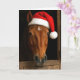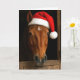 A horse wears a red Santa hat as it peeks out from a wooden stable, its warm tones beautifully contrasting with the festive colors.