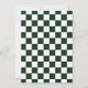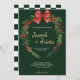 Elegant Christmas invitation with a wreath design on a dark green background featuring a red bow and festive elements. Back of the card: Blank with a textured white surface.