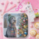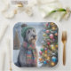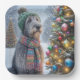 An einem schneebedeckten Tag steht ein irischer Wolfhound mit einem Strickhut und farbenfrohen Schal neben einem dekorierten Weihnachtsbaum