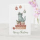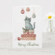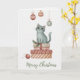 A charming holiday card in the soft, nostalgic style of Tradition Treasures. It features a sweet blue-grey kitten sitting proudly atop a stack of beautifully wrapped Christmas gift boxes, while delicate vintage baubles hang above. Soft watercolour textures and warm festive colours give this design a gentle timeless feeling. A perfect Christmas card for cat lovers and anyone who adores cosy holiday illustrations.