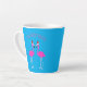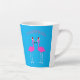 Diese phantastische latte Tasse zeigt ein digitales Kunstbild eines hübschen rosa Flamingos stehend, das sich liebevoll anschaut. Jeder Flamingo-Vogel hat hellrosa Federn mit blassrosa Beinen und einen rosa Schnabel mit schwarzer Spitze und gelben Augen mit einem schwarzen Pupil. Sie tragen alle eine rot-weiße Weihnachtsmannmütze auf ihrem Kopf. Über den Flamingos, auf denen Flamingo Belles steht, ist hübsch rosa Text. Ein tolles Geschenk für ein lesbisches Paar zu Weihnachten.