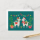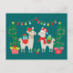 Auf dieser Weihnachtspostkarte finden sich Lahmen, die rote Schals und roten Hut tragen und Geschenke auf dem Rücken tragen. Es gibt dekorierte Kakteen und weitere Geschenke in der Nähe.