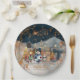 Schöne Weihnachtsschneeberge und dunkelblauer Himmel auf Party Papier Teller mit süße Figuren und Goldelementen. Die Eichhörnchen, Snowman, ein Mädchen und ein Baby, ein Fuchs, Mäuse, eine Eule, Raben und ein kleiner Vogel werden den richtigen Weihnachtsgeist hervorbringen. Große Tischdekoration für das Party/die Ansammlung