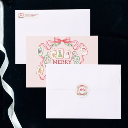 This chic Christmas design features Christmas mahjong tiles on a blush pink background. Perfect for you holiday mahjong party.
