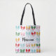 Weihnachten Mittens Snowflakes Script Name Stilvolle Tote Tag Feiertagsfäuste in Rot, Blau, Rosa, Grün und Gold schmücken diese Tote Tasche, mit einem hellblauen Schneeflockenmuster im Hintergrund. Personalisieren Sie mit Vornamen in der Mitte auf der Vorderseite, in einem schwarzen Skript-Schriftart. Wie geht es niedlicher in dieser Ferienzeit einkaufen?