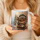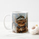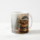 Warm up your holiday season with this cozy and adorable ceramic mug, perfect for sipping hot cocoa or coffee. The charming illustration features a sweet Highland Cow bundled up in a knit hat and a festive plaid scarf. It holds its own steaming mug while standing in a softly lit winter scene, complete with glittering snow and a decorated Christmas tree. This delightful design is sure to bring warmth and a little holiday cheer to your home.