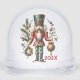 Celebrate the season with a custom snow globe featuring a colorful nutcracker adorned with holiday symbols and greenery. Customizable year.
