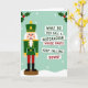 On this Christmas card, you'll find a cheerful nutcracker in a fancy green outfit with gold details, red pants, and black boots, smiling big with a white beard. The background is a soft green with white snowflakes, making it feel like winter❄️. Green holly with red berries sits at the top corners, adding to the festive look🌿. One side has a joke: "WHAT DO YOU CALL A NUTCRACKER WHOSE PANTS KEEP FALLING DOWN?" in green and red🤣. It's funny and makes you smile😄! This card is perfect for spreading holiday joy and making people laugh🎄🎁.