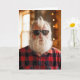 An old man wearing a red and black plaid shirt has a white beard humorously tucked up under dark sunglasses.