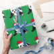 Niedliches Weihnachtstierpapier mit einem schönen Panda-Bär, der eine rote Weihnachtsmannmütze auf grünem Papier trägt. Hübsches Urlaubspapier.