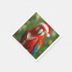 A colorful parrot wearing a red Santa hat holds a martini glass with candy canes against a lush green background, enhancing the festive feel