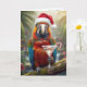 A colorful parrot wearing a red Santa hat holds a martini glass with candy canes against a lush green background, enhancing the festive feel.