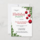 Personalisiert Moderne Party Einladungen in Rot, Grün und Weiß. Hintergrund in Weiß mit Kiefer/Weihnachtsbaumzweigen und hängenden roten Baubeln Ornamente mit Schneeflocken bestreut. Bearbeiten von Vorlagen - Fügen Sie einfach Ihren Text hinzu. Alle Texte können Schriftart, Farbe und Größe geändert werden. Ideal für Zuhause-Party, Office-Party, Corporate, Event-Dinner-Party oder jede andere Wintersaison.