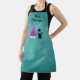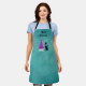 This kitchen apron is a pretty teal colour with a pink and silver glittery look Christmas tree on a white star shaped rug with a black cat beside the tree wearing a pink bow. Customise your text with the template.