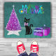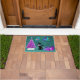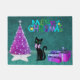 This outdoor welcome door mat has a pink and silver Christmas tree on a star rug beside a black cat with pink bow and wrapped pink and purple gifts in a room with teal coloured walls and floor with the text if festive letters Merry Christmas.