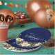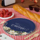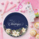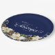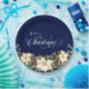 Eine runde Papiertafel mit Weihnachten in einem Design-Skript und Aquarell Poinsettia, Beeren und Kiefernzapfen als Gestaltungselemente. Elegante saisonale Teller für Ihr Party oder Ihre Feiertage. Es ist in weiß und tiefblau gehalten. Gute Feiertage. Sehen Sie sich die anderen passenden Produkte in dieser Kollektion für ein zusammenhängendes Thema an.