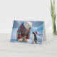 A polar bear wearing an ugly Christmas sweater is seen looking at a cute penguin wearing a Santa Claus hat, standing together on a beautiful Arctic glacier.