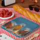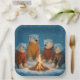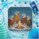 A group of polar bears sits around a campfire, dressed in colorful sweaters, as snow gently falls around them.