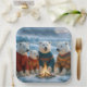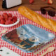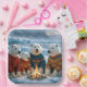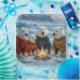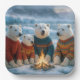 Four polar bears are sitting around a small campfire, wearing colorful knitted sweaters, with an icy, picturesque landscape surrounding them
