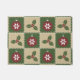 Vier Plätze in Grün und Bräune sind mit roten Ornamenten verziert, die mit weißen Schneeflocken und grünen Heiligen mit roten Beeren dekoriert sind. Weiße Nähte fügen eine dekorative Touch hinzu, die dem sich wiederholenden Muster das Aussehen eines Stepps verleiht und ein sehr gemütliches Gefühl für den Weihnachtsurlaub schafft.