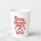 Quote: Official Holiday Spirits Taster.  Red text. Decorated with glasses of wine, Santa's hat, coctail glass and snow crystals,