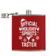 Quote: Official Holiday Spirits Taster. Red background, white text. Decorated with glasses of wine, Santa's hat, coctail glass and snow crystals,
