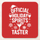 Quote: Official Holiday Spirits Taster. Red background, white text. Decorated with glasses of wine, Santa's hat, coctail glass and snow crystals,
