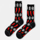 Christmas novelty socks with rows of spicy red chili peppers and white snowflakes.