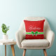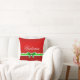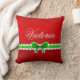 Schönes festlich rotes Kissen mit grünem Bogen und personalisiertem Text.