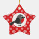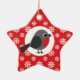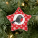 Diese Weihnachtsschmuck-Keramik zeigt ein Rotkehlchen, umgeben von Schneeflocken auf rotem Hintergrund. Es ist eine schöne Ergänzung zu Ihren Weihnachtsdekorationen.