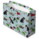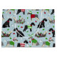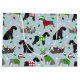 Niedliche Weihnachtsschnauzer mit Salz und Pfeffer und Schwarz- und Silbermäntel tragen Weihnachtsmannmützen, Geweih- und Raute-Pullover auf blauem Hintergrund mit verstreuten Ziergegenständen.