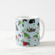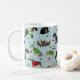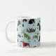 Niedliche Weihnachtsschnauzer mit Salz und Pfeffer und Schwarz- und Silbermäntel tragen Weihnachtsmannmützen, Geweih- und Raute-Pullover auf blauem Hintergrund mit verstreuten Ziergegenständen.