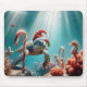 A sea turtle wearing a Santa hat swims among candy canes, coral, and seahorses in a festively decorated underwater scene