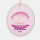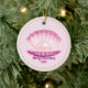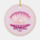 Dieses Keramik-Ornament mit einer hübschen dekorativen Muschel in Pflaume und Rosa-Tönen mit einem Bild einer glänzenden Perle im Inneren gezeigt. Der individuell anpassbare Text von "Frohe Weihnachten 2025" ist in Pflaumenfarbe. Hat eine goldene Farbgrenze. Bilder werden auf Vorder- und Rückseite gedruckt. Denken Sie daran, beide Seiten dieses Ornaments anzupassen, wenn Sie es anpassen. Passen Sie dieses Element mit dieser Vorlage an oder kaufen Sie es wie gezeigt. Lizenziertes Bild