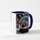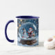 A Christmas personalized coffee cup with beautiful snow globes featuring Santa Clause, Reindeer, Christmas tree and a vintage train.