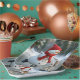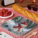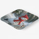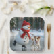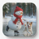 A cheerful snowman in a red knitted hat and scarf joyfully skates on a frozen pond, while a playful terrier dog joins the fun against a snowy forest backdrop