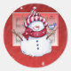 Ein niedlicher Schneemann mit einer rot-weiß gestreiften Mütze und einem rot-rosa Schal mit kleinen Lieben. Er hat eine Karottennase und Arme. Ein blauer Vogel sitzt auf dem Snowman-Stick-Arm. Der Hintergrund ist rot mit Schneeflocken, die zufällig verstreut sind. Im Hintergrund zentriert ist ein Notenblatt.