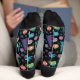 A Colorful Unsex Christmas Crew Sock Design In The Christmas Spirit With Trees, Gifts and Ornaments On Black