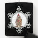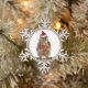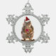 Zinschneeflockeverzierung mit einem Foto eines Weihnachtseichhörnchens, das einen roten und weißen Weihnachtsmann-Hut trägt und eine Zuckerstange mit einem großen roten Bogen hält. Sie hüten diese Spaß Weihnachtsbaumverzierung für viele Jahre!
