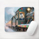 A charming polar bear joyfully waving from a vintage steam locomotive, beautifully adorned with festive Christmas decorations, all set against a backdrop of snowy railroad tracks