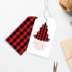 This design features a Christmas holiday red cute simple gift tag, with Merry Christmas red and white text and winter farm style Christmas tree, a classic buffalo plaid check, a classic black and red pattern, a minimalist calligraphy typography script, modern calligraphy script font, a calligraphy merry Christmas, a classy country farmhouse simple Xmas, a Christmas holiday gift favor tag, a Christmas gift wrap wrapping supplies