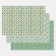 This set of wrapping paper sheets has three different retro-looking Christmas tree patterns, inspired by the 1950s designs: Trees and Snowflakes, with decorated green trees and red snowflakes, Trees in Snow, which has snow-covered evergreen trees on a blue and white snowy background, and Trees on Green, featuring green, ivory, apricot, and blue minimalist trees on a green background.
