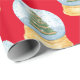 Feierliche Weihnachtsgeschenk-Wrap zeigt Muster von Aquarellschnee-Kugeln mit Weihnachtsbaum auf rotem Hintergrund.