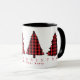 This design features a Christmas holiday cute trees custom, a winter whimsical festive merry, a merry Christmas simple typography, a winter buffalo plaid check checkered, a fun customized Christmas holiday gift, a Christmas drinkware coffee tea mug, with a minimalist minimal simple lettering, a modern style contemporary font text, a Christmas holiday red and black, simple holiday plaid pattern