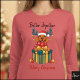 The dog is drawn in a happy, stylized manner, showing a smooth, short russet-colored coat. It is positioned sitting behind and resting its paws on a wrapped gift box. The dog is dressed for the holidays with a red Santa Hat and wears teal blue Reindeer Antlers decorated with hanging gold ornaments. Notably, this image lacks the scarf seen on the previous dogs in the series. The gift box is a contrasting Teal Blue and Gold Striped pattern, topped with a large gold bow. Scattered red and gold Christmas balls are visible around the base. The background is a plain light gray.