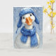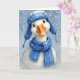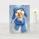 A whimsical watercolor goose wearing a blue hat and scarf, surrounded by softly falling snow, creates an enchanting winter scene.