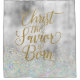 Christus der Erlöser ist Geborener Weihnachtsduschvorhang Lichtsilber Hintergrund mit Imitaten Diamantfunkel Rand, mit Gold Christus der Erlöser ist geborene Kalligraphie Typografie. Schöne Christliche Weihnachtsbadedekoration. Friedlich. Der Duschvorhang Shop von Vikkelynn Designs & Co.