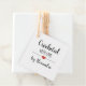 Moderne "Crocheted with Liebe" bevorzugen das Etikett mit einem schwarzen Schriftart auf einem Pappboden, der durch ein niedliches rotes Herz geschmückt ist. Text anpassen.