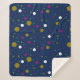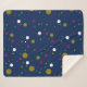 Ein Muster von Kreise unterschiedlicher Größe in Gold, Weiß, lila und Grün ist auf einem dunkelblauen Hintergrund verstreut. Die Kreise sind gleichmäßig verteilt und variieren im Durchmesser.
