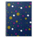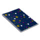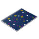 Ein Muster von Kreise unterschiedlicher Größe in Gold, Weiß, lila und Grün ist auf einem dunkelblauen Hintergrund verstreut. Die Kreise sind gleichmäßig verteilt und variieren im Durchmesser.